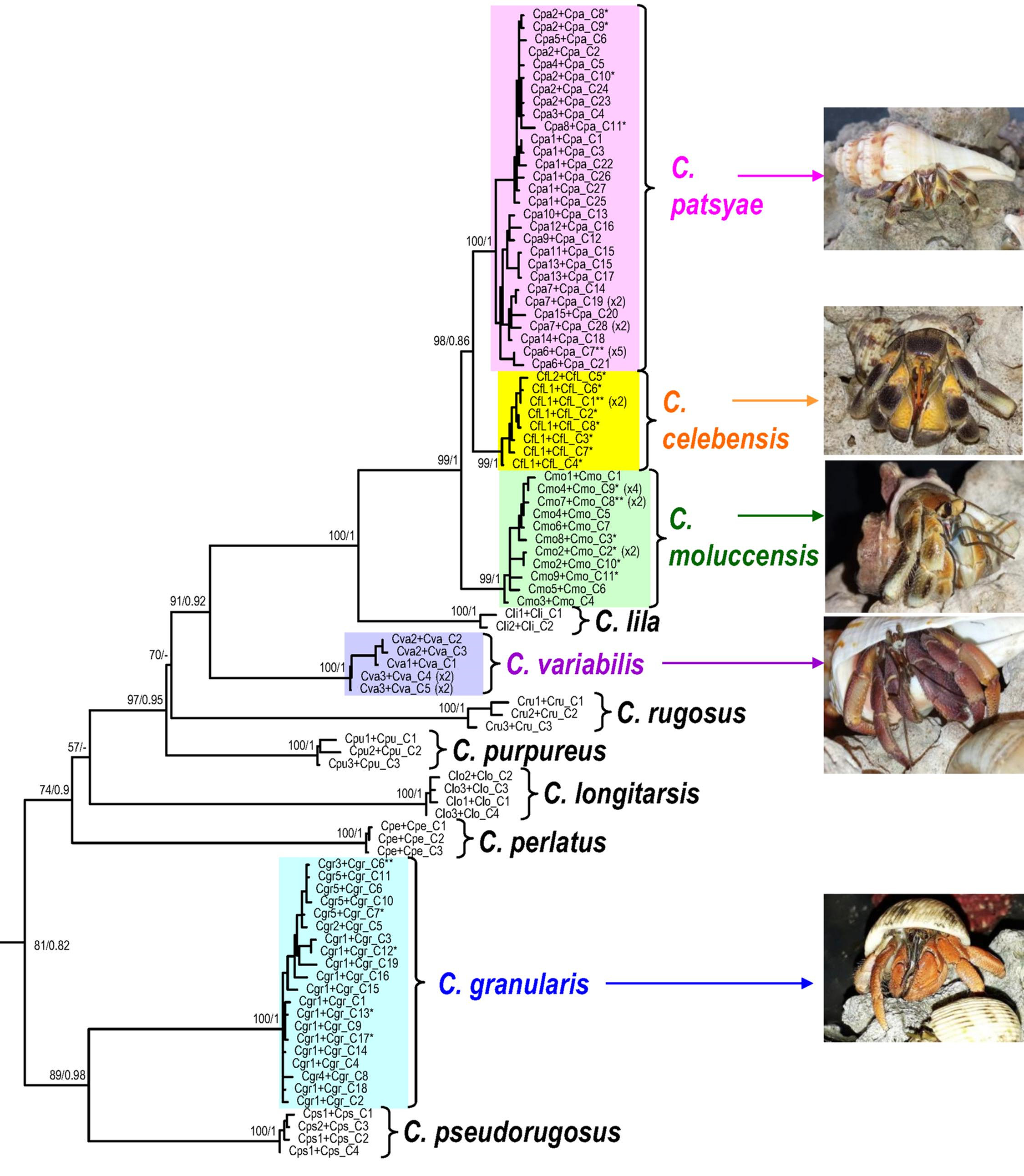 Four new species of land hermit crabs from Indonesia are described based on morphological differences and mitochondrial 16S rDNA and COI data. Coenobita moluccensis, C. patsyae, and C. celebensis form a major clade in the phylogenetic tree, exhibiting morphological similarities, particularly in the structure of the male sexual tubes. Coenobita granularis, from Central Sulawesi, shares morphological similarities with the genetically closely related C. pseudorugosus, especially in the male sexual tubes. In addition, a newly recorded species, C. variabilis, has been confirmed in West Papua. This study increases the total number of Coenobita species known from Indonesia to 13.