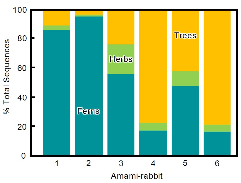 Sequence compositions of OTUs categorized into trees, herbs and ferns based on DNA metabarcoding analysis for six fecal samples from Amami rabbit (Pentalagus furnessi).