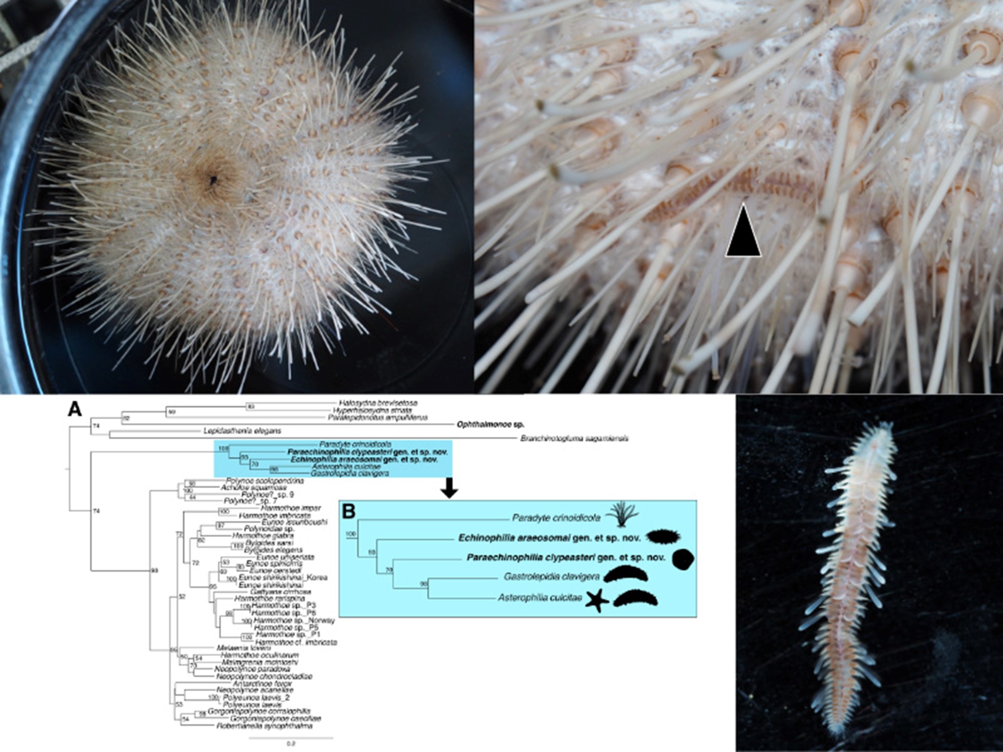 This study describes two new genera and species of scale worms (Polynoidae) associated with sea urchins from Sagami Bay, Japan. Symbiotic relationships between polychaetes and sea urchins are remarkably rare compared to those with other echinoderms, largely due to the defensive barrier of venomous spines. By integrating detailed morphological observations and multi-gene phylogenetic analyses, we reveal the evolutionary distinctiveness of these worms and their adaptations for living within this challenging microhabitat. These findings expand our understanding of marine symbiosis and suggest previously overlooked diversity among echinoderm-associated annelids.