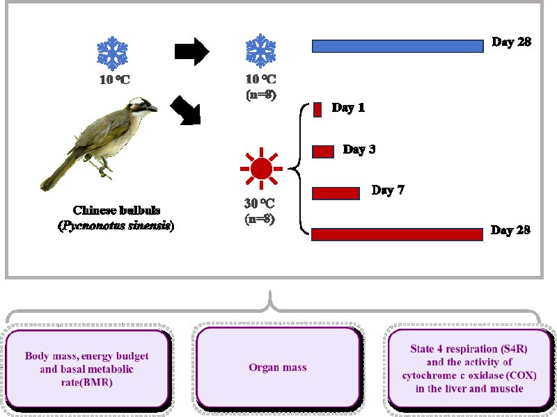 In order to explore whether prior exposure to cool temperatures exacerbates the birds’ response to warm temperatures and affects tissue-specific physiological response rates under temperature fluctuations, our study examined the effects of cool-warm thermal acclimation on metabolic thermogenesis in different tissues of Chinese bulbuls (Pycnonotus sinensis). The findings revealed that the small intestine mass and liver metabolism rapidly decreased on the first day of transfer to a warm environment, while the muscle response to such thermal changes was relatively slow, suggesting tissue-specific differences in the physiological response rates to warm temperatures. These results offer valuable insights into the regulation of diverse biological processes that mediate the physiological adjustments of Chinese bulbuls during seasonal temperature fluctuations.
