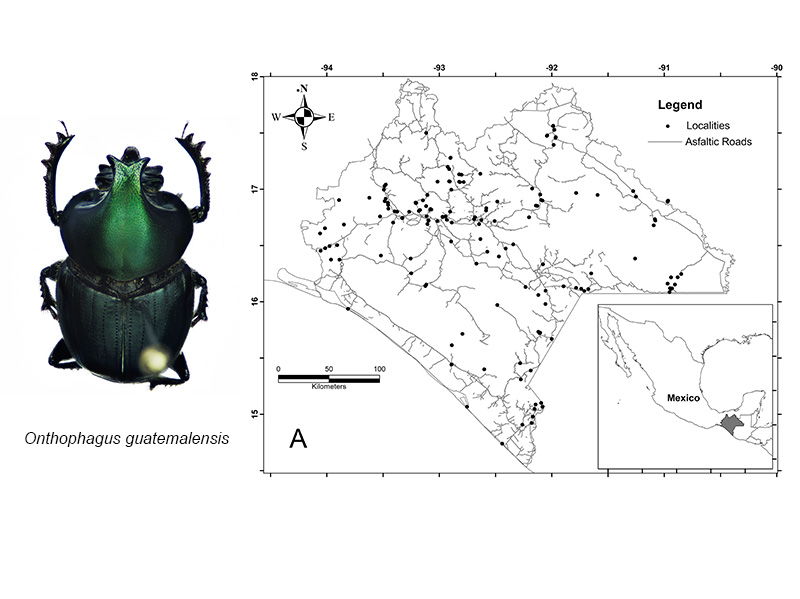 A biodiversity analysis of the Scarabaeinae dung beetles of Mexico's Chiapas state is presented. The checklist includes 134 species belonging to 24 genera. Fourteen of these species are endemic and are mainly restricted to montane forests. Onthophagus, Canthon and Phanaeus are the most speciose genera, which together account for 44.8% of the richness. However, these numbers are likely underestimated, and many species are waiting to be recorded or described for the state. In addition, knowledge gaps exist in several regions of the state that contain a wide variety of ecosystems. For these reasons, there is a clear need to further study this group of beetles in poorly explored regions to contribute to the knowledge of their true diversity, or at least to have a better approximation.