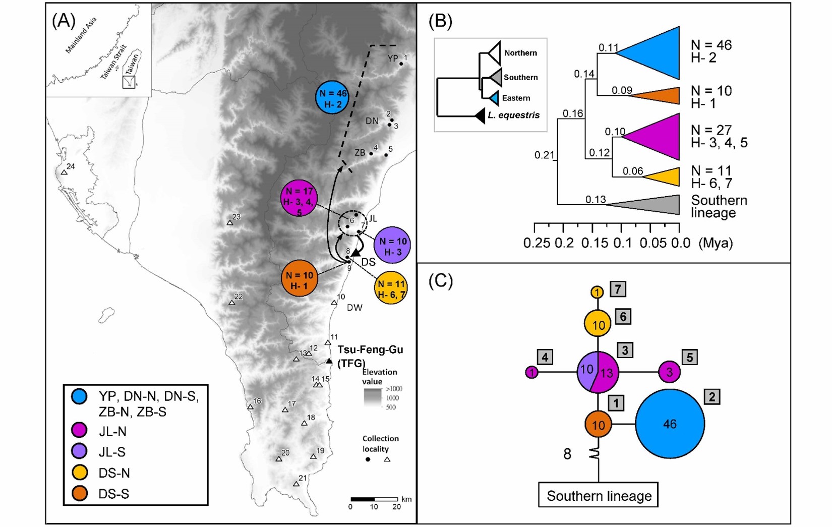 The Loxoblemmus appendicularis complex (LAC) inhabits low hills in Taiwan, where limited flight ability has shaped genetic diversification through geographic isolation and Pleistocene climatic fluctuations. Analyses of mitochondrial 16S rRNA and AFLP data indicate dispersal into southeastern Taiwan via southern low hills around 0.21 Mya, followed by northward expansion across rivers around 0.12–0.14 Mya. Genetic evidence suggests three refugia possibly associated with hot springs, with subsequent postglacial expansion leading to partial genetic admixture. Overall, both geographic barriers and historical climate changes have jointly affected the diversification history of the LAC in southeastern Taiwan.
