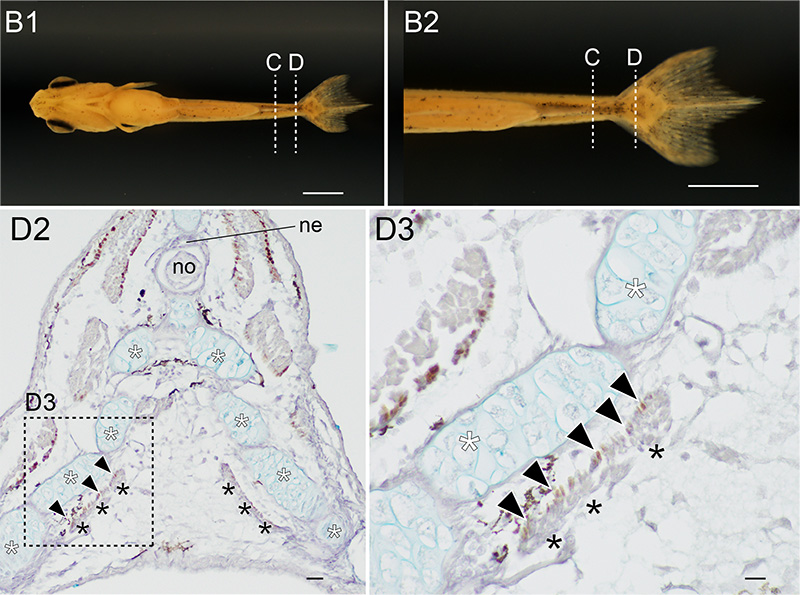 The twin-tail morphology of ornamental goldfish is a product of artificial selection. This unique structure does not exist in any other fish lineages, and remarkably, the twin-tail goldfish possess a distinct muscle structure found exclusively in their lineage. This suggests that an entirely novel muscle structure has emerged during the process of artificial selection. In this study, we conducted immunohistochemical analyses on this twin-tail-specific muscle structure. Our findings indicate that the distribution of slow muscle fibers follows pre-existing morphogenetic mechanisms, despite the extreme morphological divergence introduced by selective breeding. These results provide crucial insights into the relationship between selective pressures and inherent developmental mechanisms, shedding light on how newly emerged morphologies are shaped through a combination of evolutionary constraints and artificial selection.