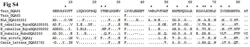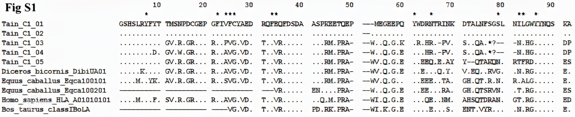 Bos taurus). The GenBank accession numbers for α1 (exon2) sequences from other mammals are AF055346 (Diceros_bicornis_ DibiUA01), DQ083407 (Equus_caballus_Eqca100101) and DQ145597 (Equus_caballus_Eqca100201), GU812295 (Homo sapiens_HLA_A01010101) and L02834 (Bos_taurus_classIBoLA).