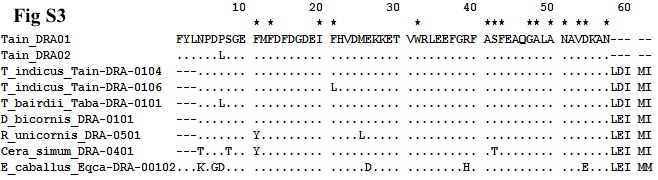 Equus caballus). The GenBank accession numbers for DRA (exon2) sequences from other mammals are KM347953 (T_ indicus_Tain-DRA-0104) and KM347956 (T_indicus- Tain-DRA-0106), AF113547