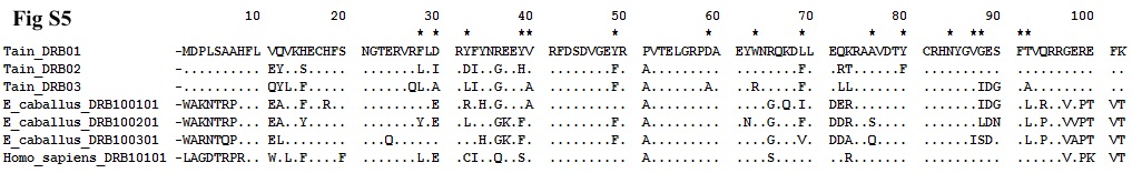 Homo sapiens). The GenBank accession numbers for DRB (exon2) sequences from other mammals are JQ254085 (E_ caballus_DRB100101), JQ254084 (E_caballus_ DRB100201), JQ254086 (E_caballus_DRB100301), and AF029288 (Homo_sapiens_DRB10101).