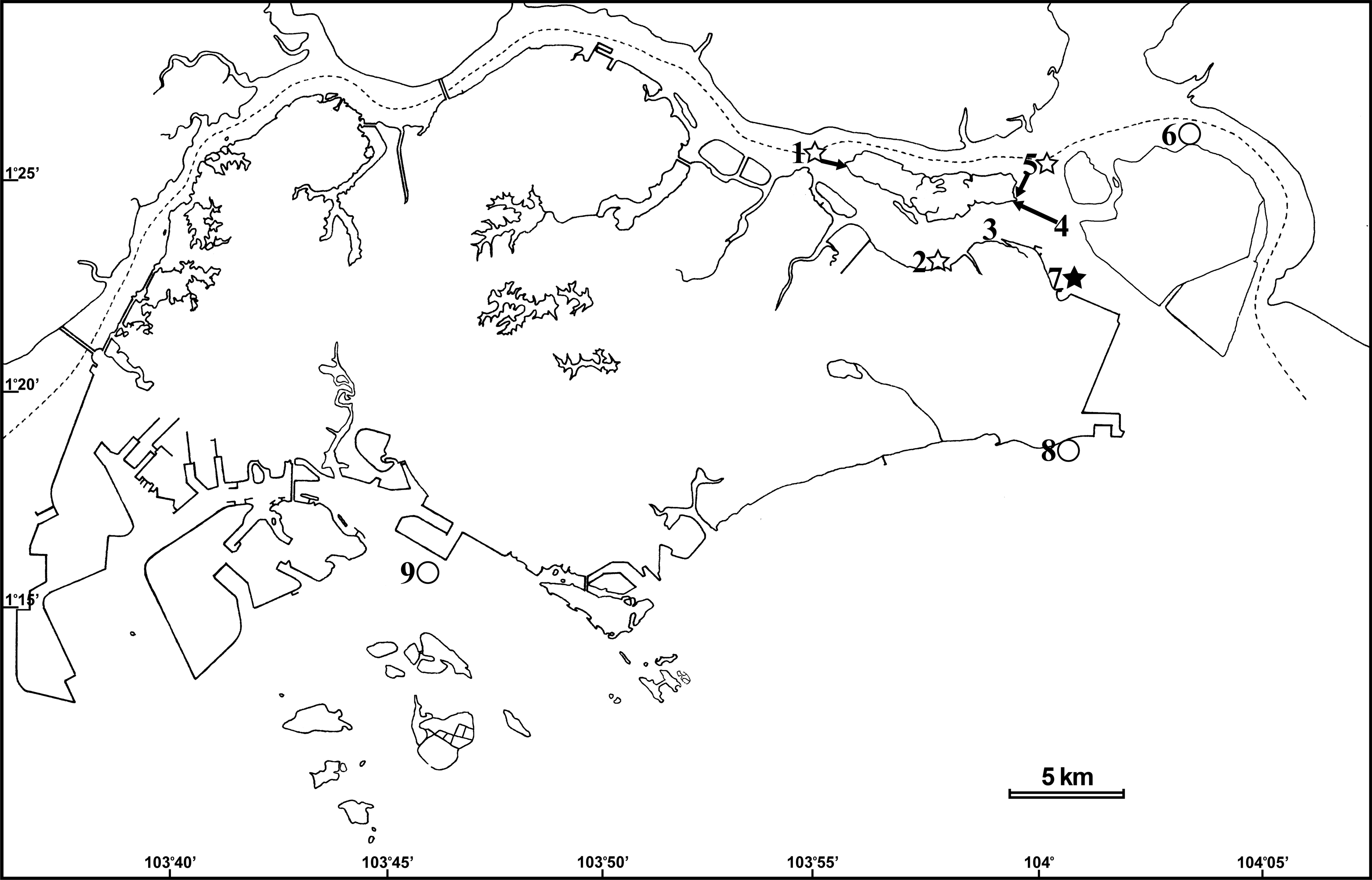 were collected for this study: 1, Pulau Ubin OBS Camp (1°25'07.7"N, 103°55'44.3"E); 2, Pasir Ris (1°22'56.45"N, 103°57'3.88"E); 3, Changi Region beaches [this area encompass the following localities that are in very close proximity to each other: Changi beach, Changi beach near Carpark 4; Changi Point beaches; Changi Point SAF Chalet beach; Changi Point Ferry Terminal beach] (1°23'33.34"N, 103°59'20.94"E); 4, Pulau Sekudu (1°24'19"N, 103°59'17"E); 5, Chek Jawa (1°24'25"N, 103°59'23"E); 6, Beting Bronok (1°26'13.00"N, 104°02'58.00"E); 7, Changi beach near Carpark 7 (1°22'26.03"N, 104°0'24.79"E); 8, Changi East next to Changi water Reclamation Plant (1°18'45"N, 104°00'31"E); 9, Cyrene Reef (Terumbu Pandan) (1°15'28"N, 103°45'19"E). White circles represent