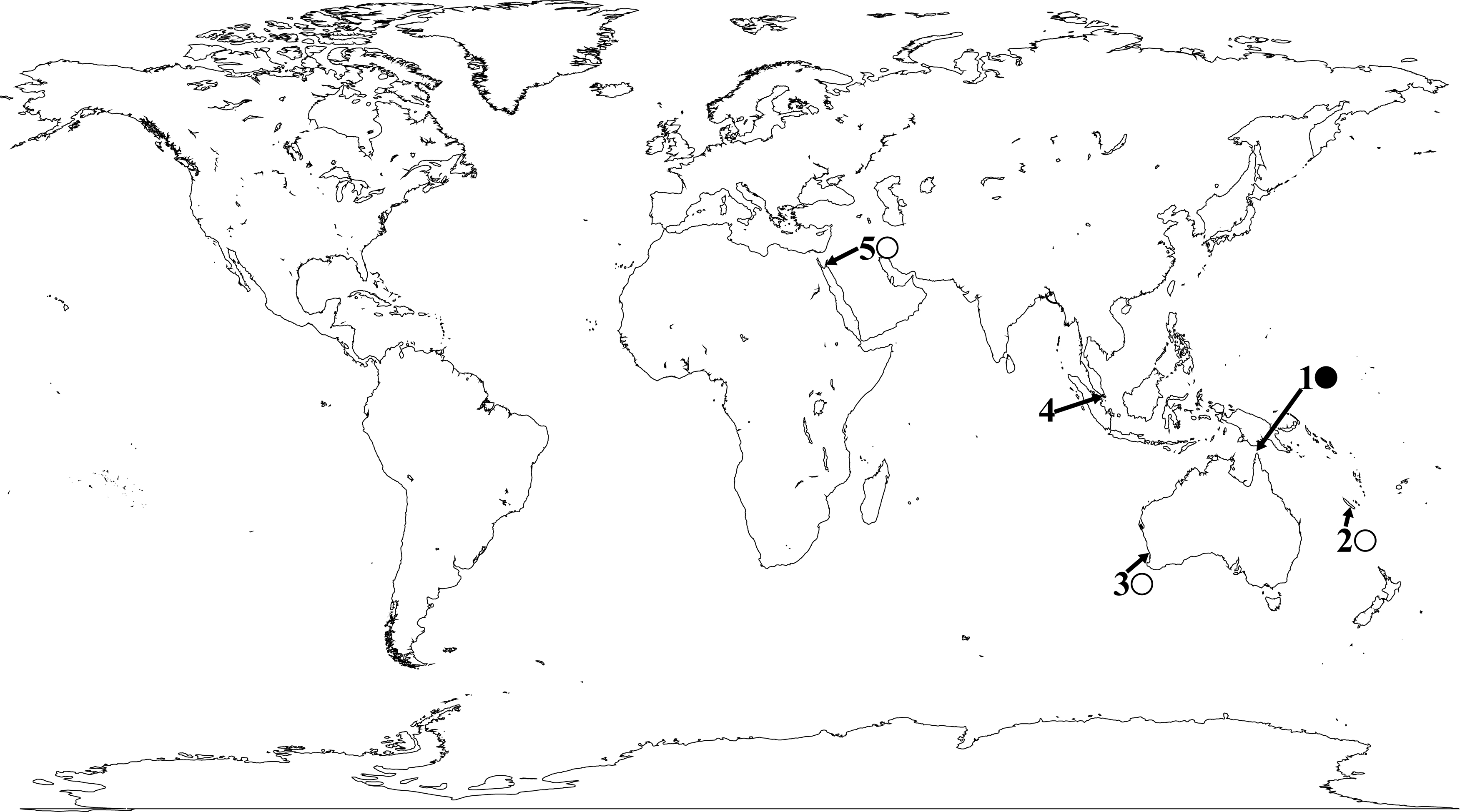 Macrodactyla fautinae sp. nov. 1. Murray Islands, Torres Straits. 2. Noumea, New Caledonia. 3. Perth, Western Australia. 4. Singapore. 5. Eilat, Israel. Symbols beside each number represent the occurrence of the sea anemones: circles being