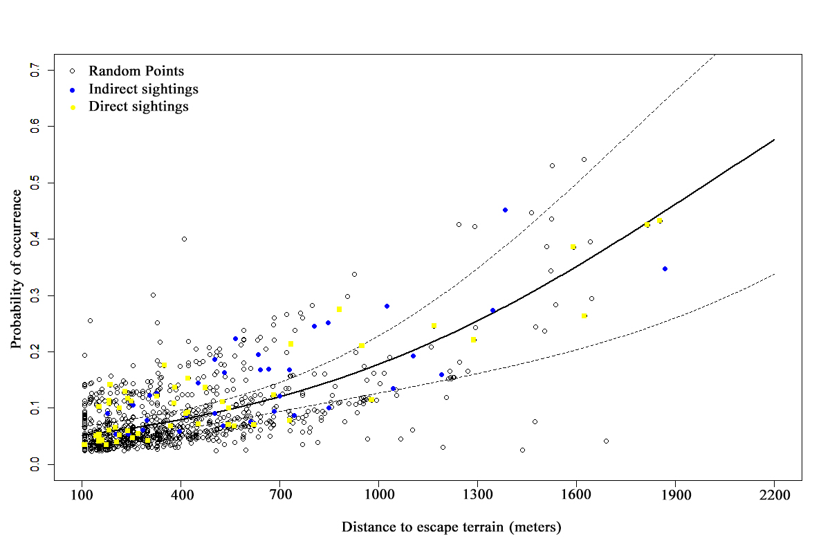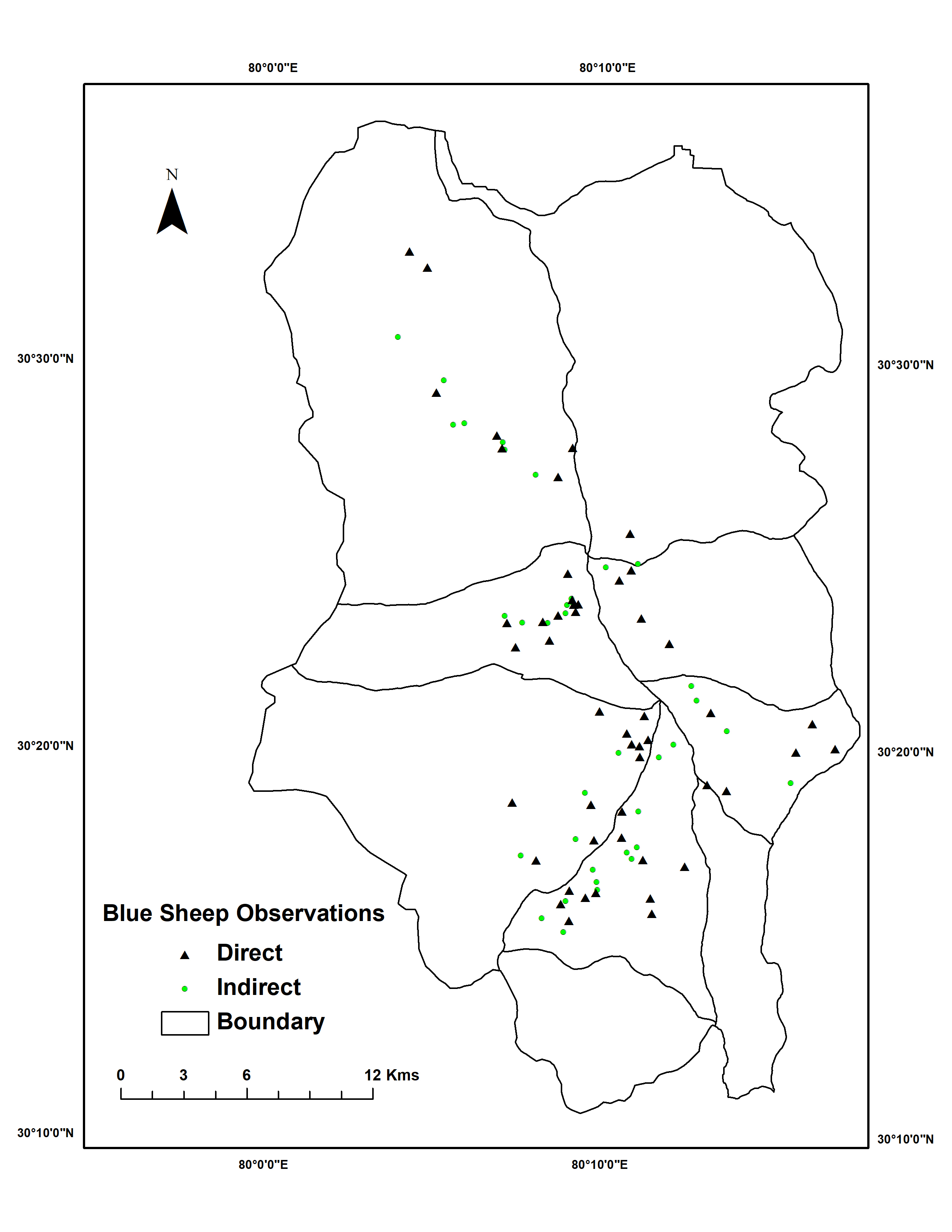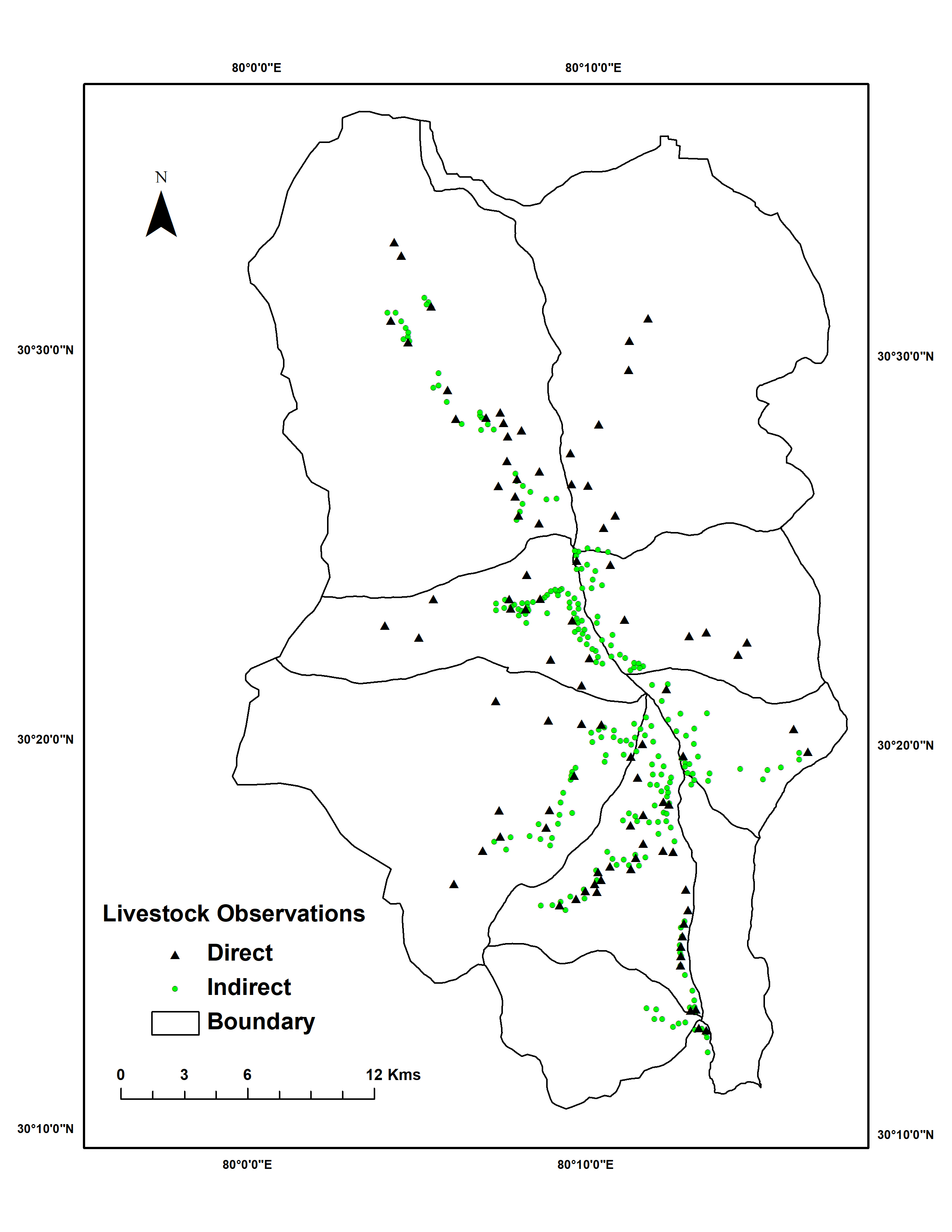 In-depth knowledge of distribution and factors influencing it is important for species conservation and management. Many forms of such data have led to the development of new analytical techniques for better interpretation. For mountainous terrains with certain limitations, species data are obtained in the presence-only form. The point process model is one of the recent approaches for modelling such data, taking care of pseudo-absences and spatial independence. For conservation in regions with limited resources and species with similar ecological requirements, it is important to properly assess the extent of competition extent between wild and domestic species. We attempted to use point process framework to estimate the function of resource selection in blue sheep (Pseudois nayaur) in areas influenced by pastoralism in a western Himalayan region. Our study is the first attempt to use this framework to estimate resource selection on a dataset not collected using radio-telemetry. Spatial locations of blue sheep and livestock and a background sample of random points with six topographic covariates were used to model resource selection probability via intensity function. Blue sheep showed its predicted presence in areas with open vegetation coinciding with alpine meadows, influenced by southern aspect keeping a threshold distance of 600–1000 m from cliffs (escape terrain). Livestock, also showed presence probability in open vegetation, but at lower altitudes, mainly on valley floors. Our results suggest that though blue sheep continued to use the same habitat type after livestock arrival, they selected different resources based on topographic factors. Livestock were in areas where it was convenient for pastoralists to establish campsites and where nutritious grasses were present, making it feasible to graze. Thus, we argue that the probable shift in habitat for blue sheep from optimal areas occurs due to livestock presence, which might disturb their nutritional balance. Our study provides helpful insights for managing rangelands, which when tied with dietary patterns will give a better idea for proper conservation measures in the future.