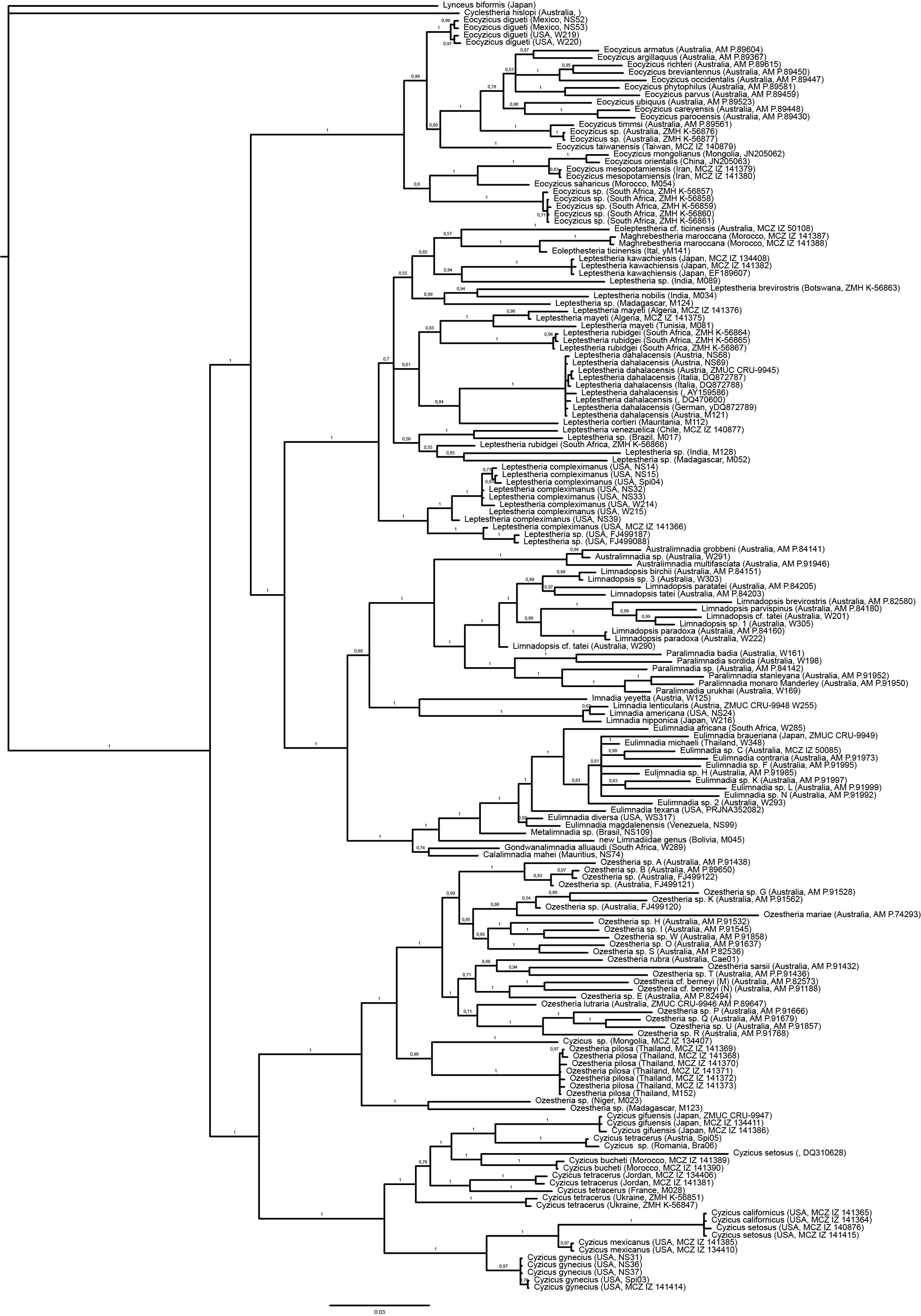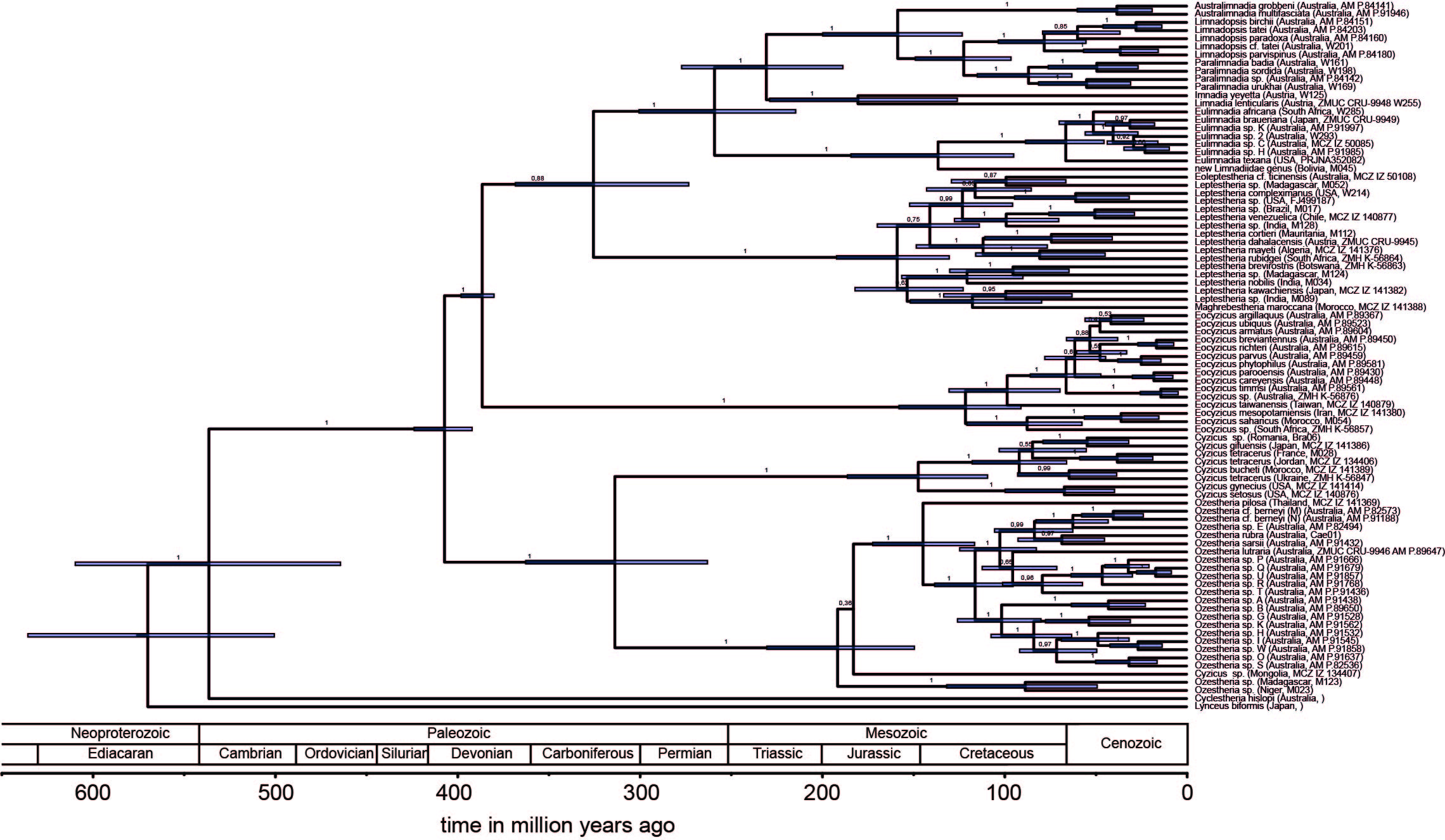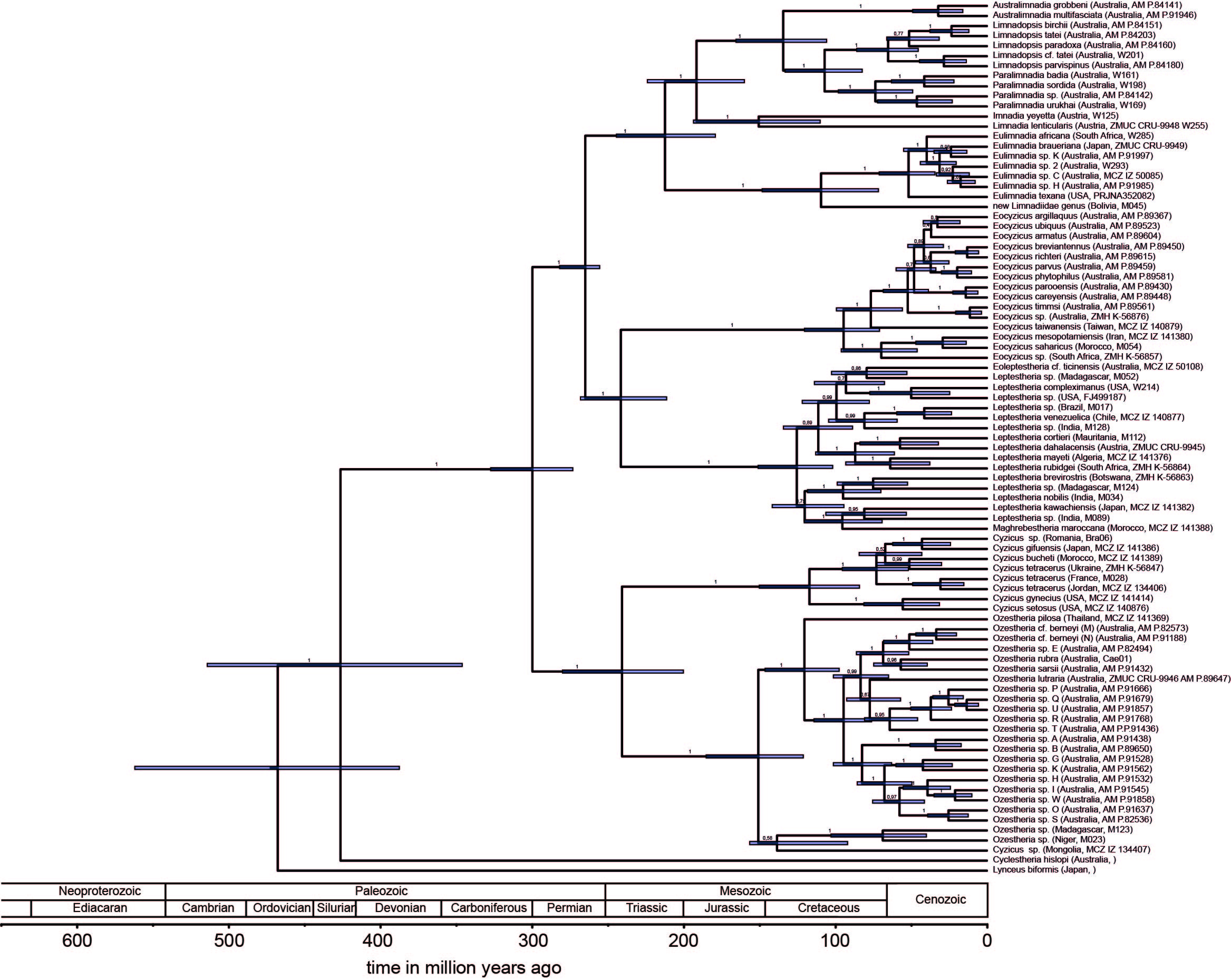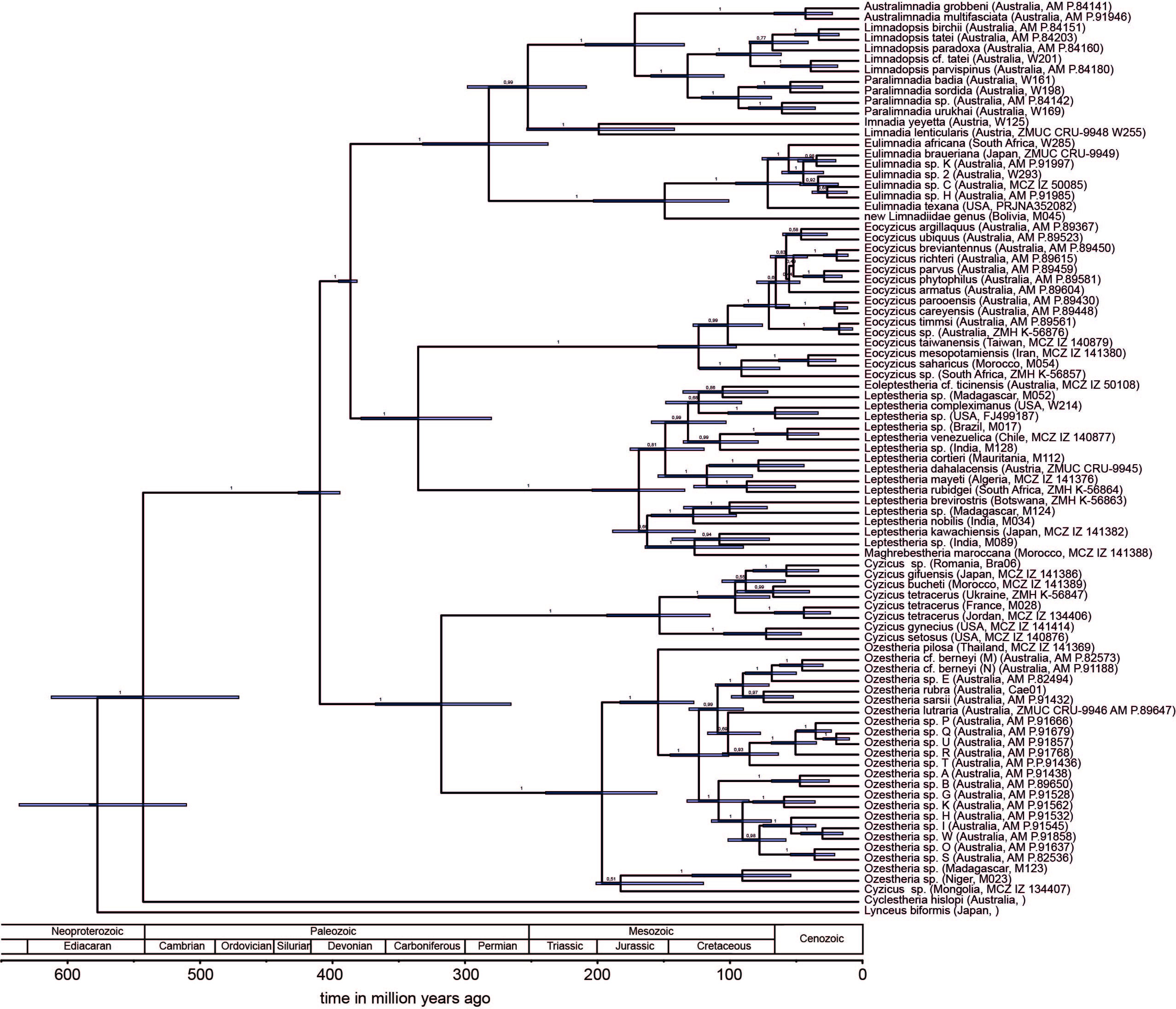 Spinicaudata (spiny clam shrimp) is a taxon of Branchiopods occurring since the Devonian and today it occurs nearly globally in temporary water bodies. We present the most species-rich phylogenetic analyses of this taxon based on four molecular loci: COI, 16S rRNA, EF1α and 28S rRNA. Our results support previous findings that Cyzicidae sensu lato is paraphyletic. To render Cyzicidae monophyletic we establish a fourth extant spinicaudatan family to accommodate Eocyzicus. Within Cyzicidae, none of the genera Cyzicus, Caenestheria or Caenestheriella are monophyletic, and the morphological characters used to define these genera (condyle length and rostrum shape) are not associated with well-delimited clades within Cyzicidae. There is insufficient resolution to elucidate the relationships within Leptestheriidae. However, there is sufficient evidence to show that the leptestheriid genera Eoleptestheria and Leptestheria are non-monophyletic, and there is no support for the genus Leptestheriella. Molecular clock analyses suggest that the wide geographic distribution of many spinicaudatan taxa across multiple continents is largely based on vicariance associated with the break-up of Pangea and Gondwana. Trans-oceanic dispersal has occurred in some taxa (e.g., Eulimnadia and within Leptestheriidae) but has been relatively rare. Our results highlight the need to revise the taxonomy of Cyzicidae and Leptestheriidae and provide evidence that the global spinicaudatan diversity may be underestimated due to the presence of numerous cryptic species. We establish Eocyzicidae fam. nov. to accommodate the genus Eocyzicus. Consequently, Cyzicidae comprises only two genera – Cyzicus and Ozestheria. Ozestheria occurs also in Africa and Asia and Ozestheria pilosa new comb. is assigned to this genus.