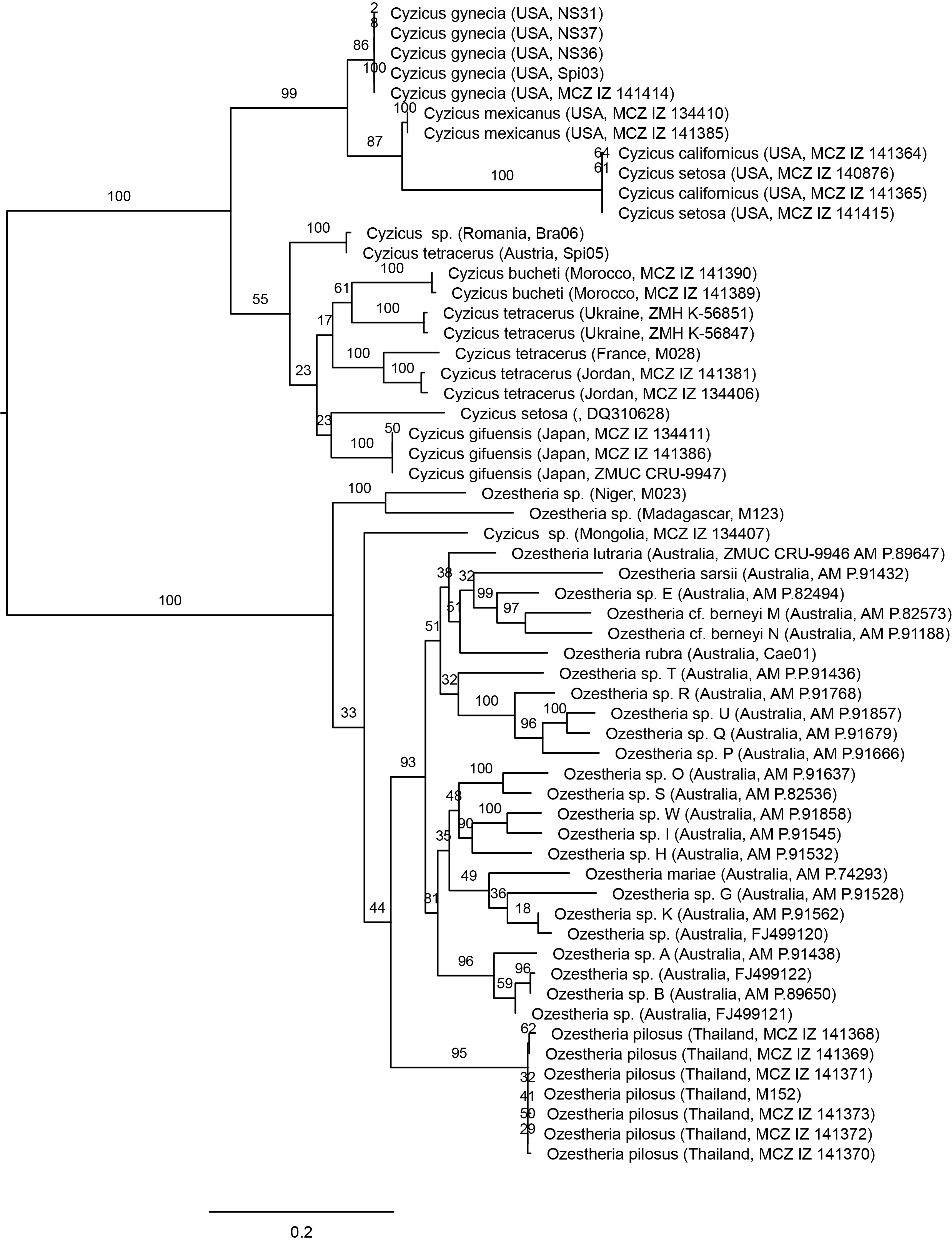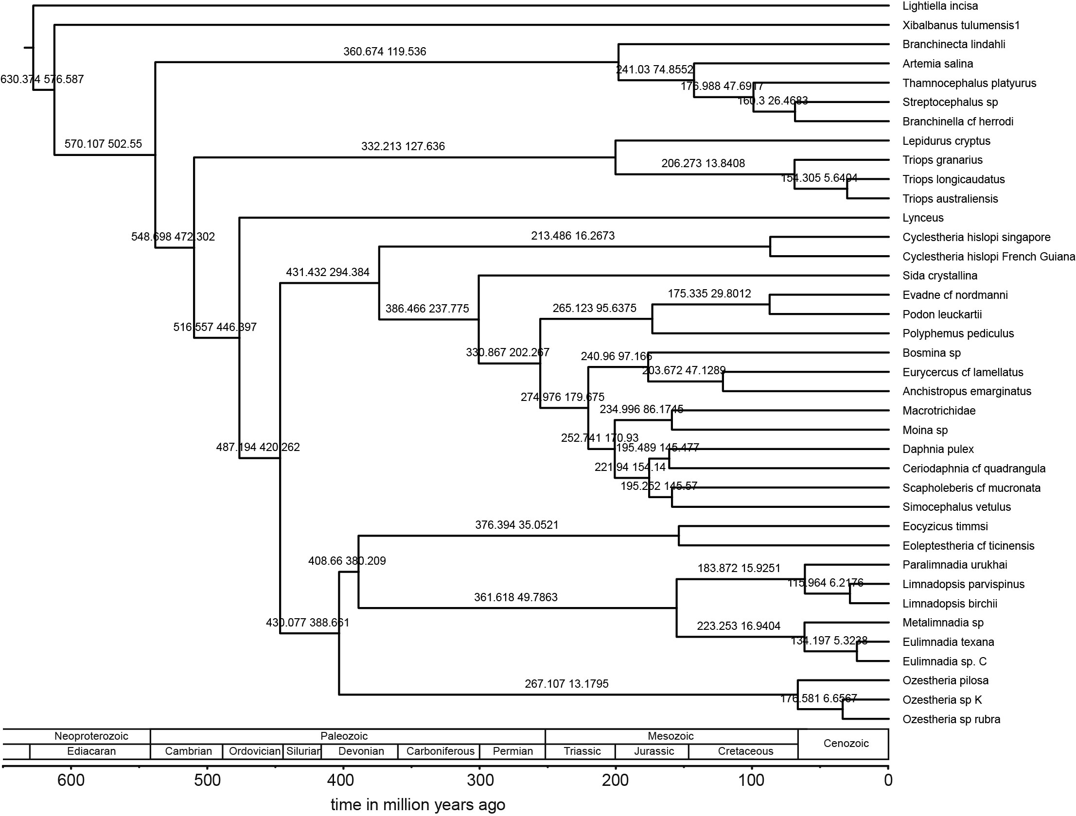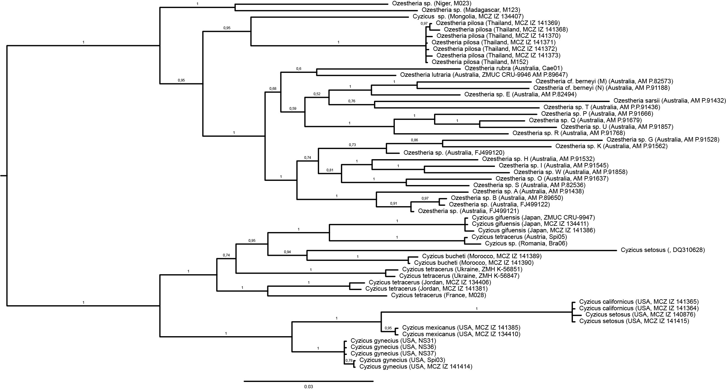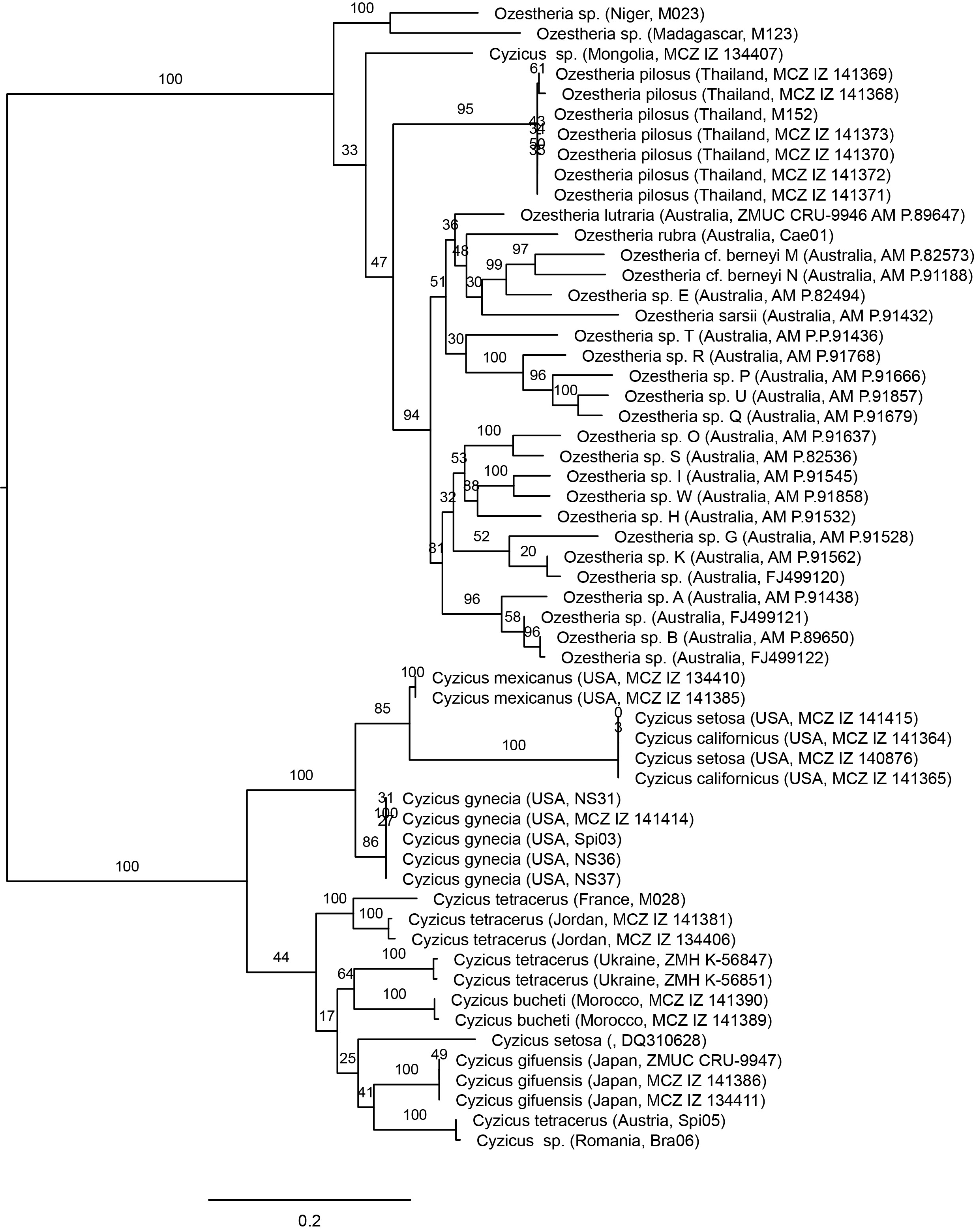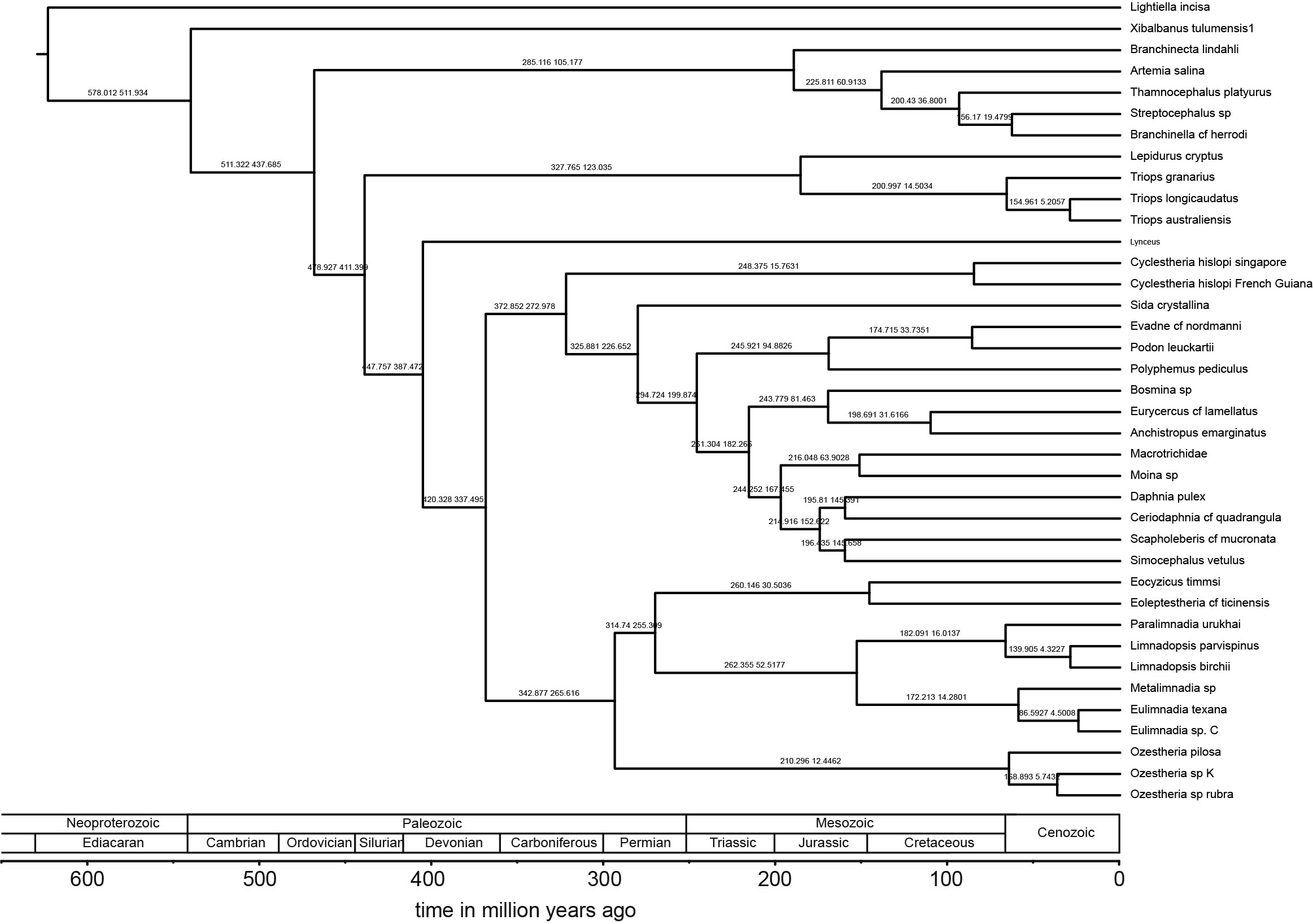 Spinicaudata (spiny clam shrimp) is a taxon of Branchiopods occurring since the Devonian and today it occurs nearly globally in temporary water bodies. We present the most species-rich phylogenetic analyses of this taxon based on four molecular loci: COI, 16S rRNA, EF1α and 28S rRNA. Our results support previous findings that Cyzicidae sensu lato is paraphyletic. To render Cyzicidae monophyletic we establish a fourth extant spinicaudatan family to accommodate Eocyzicus. Within Cyzicidae, none of the genera Cyzicus, Caenestheria or Caenestheriella are monophyletic, and the morphological characters used to define these genera (condyle length and rostrum shape) are not associated with well-delimited clades within Cyzicidae. There is insufficient resolution to elucidate the relationships within Leptestheriidae. However, there is sufficient evidence to show that the leptestheriid genera Eoleptestheria and Leptestheria are non-monophyletic, and there is no support for the genus Leptestheriella. Molecular clock analyses suggest that the wide geographic distribution of many spinicaudatan taxa across multiple continents is largely based on vicariance associated with the break-up of Pangea and Gondwana. Trans-oceanic dispersal has occurred in some taxa (e.g., Eulimnadia and within Leptestheriidae) but has been relatively rare. Our results highlight the need to revise the taxonomy of Cyzicidae and Leptestheriidae and provide evidence that the global spinicaudatan diversity may be underestimated due to the presence of numerous cryptic species. We establish Eocyzicidae fam. nov. to accommodate the genus Eocyzicus. Consequently, Cyzicidae comprises only two genera – Cyzicus and Ozestheria. Ozestheria occurs also in Africa and Asia and Ozestheria pilosa new comb. is assigned to this genus.