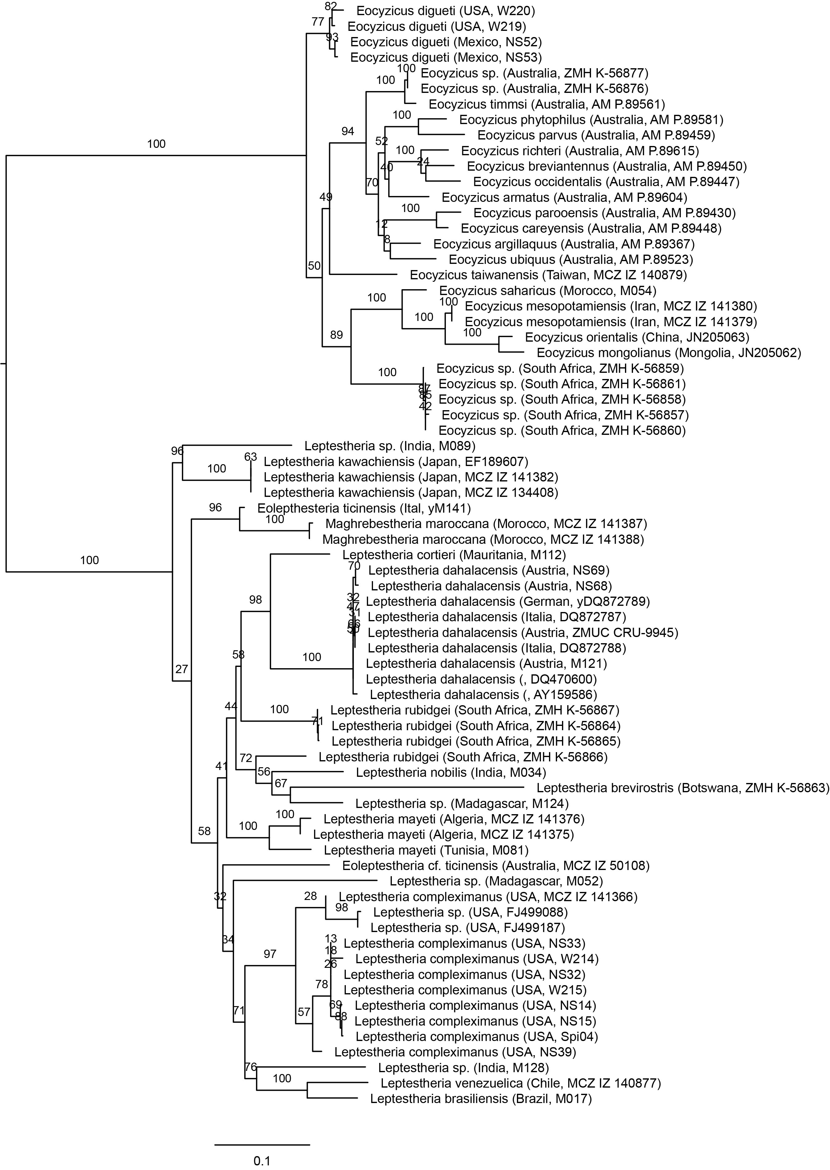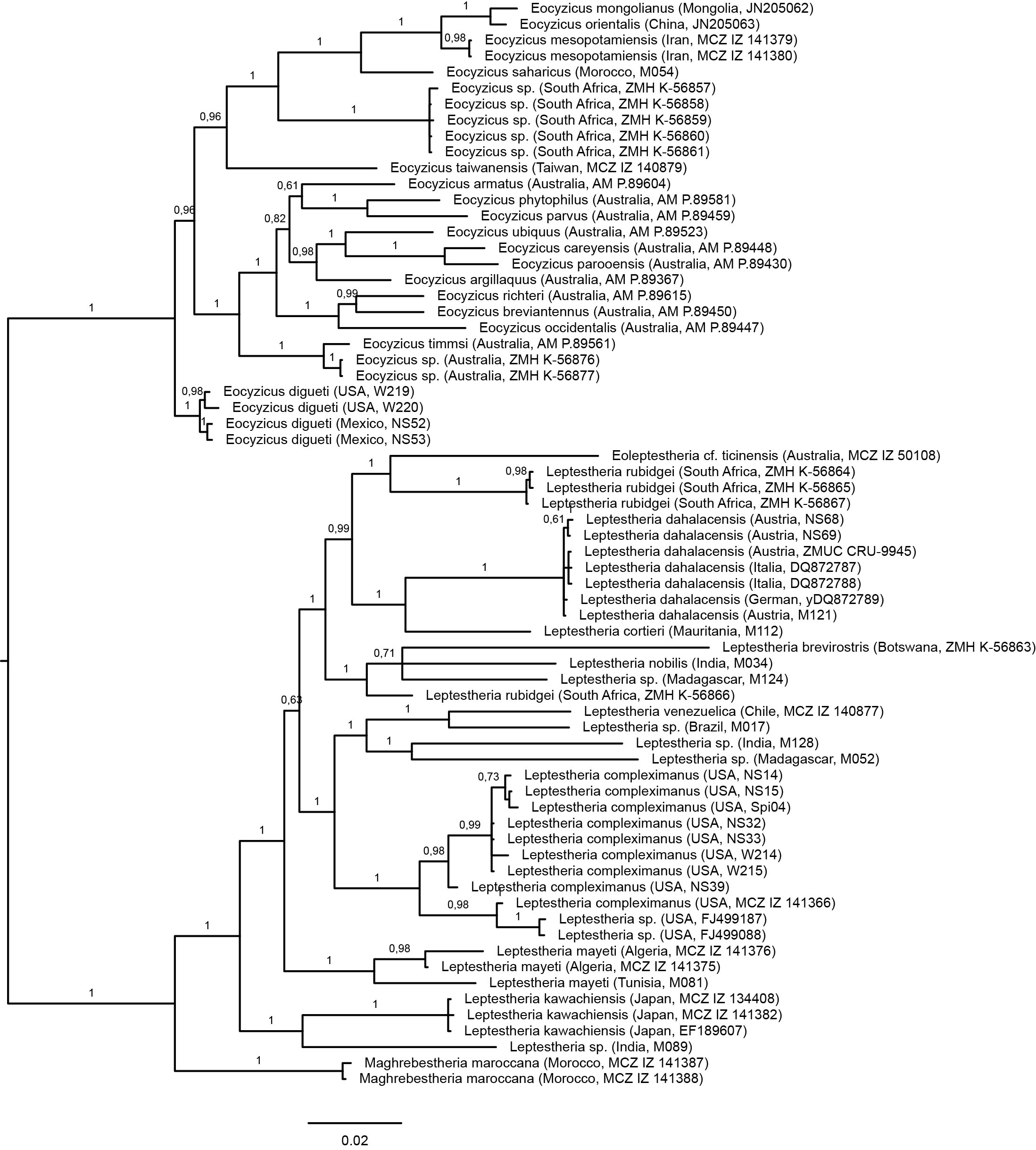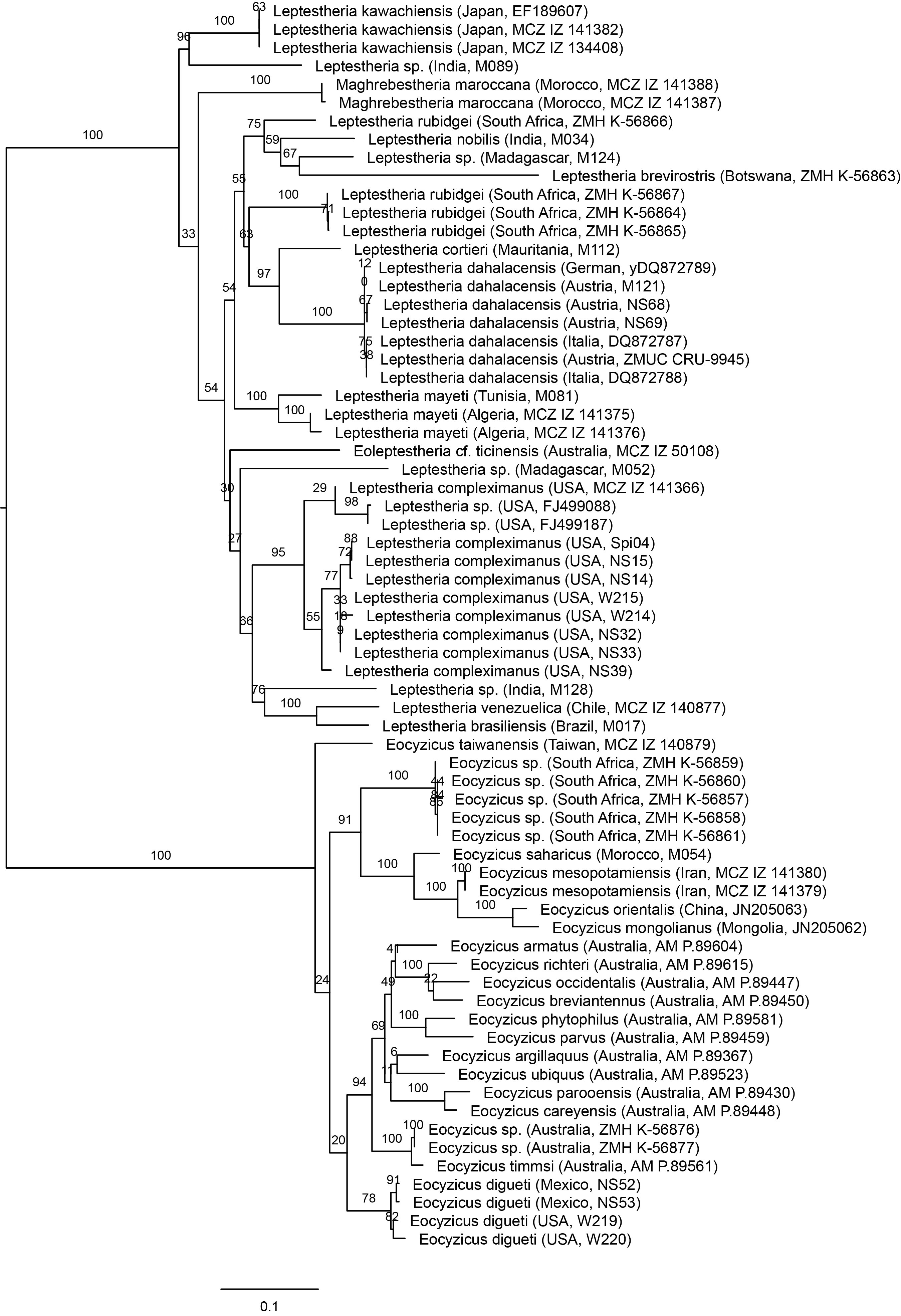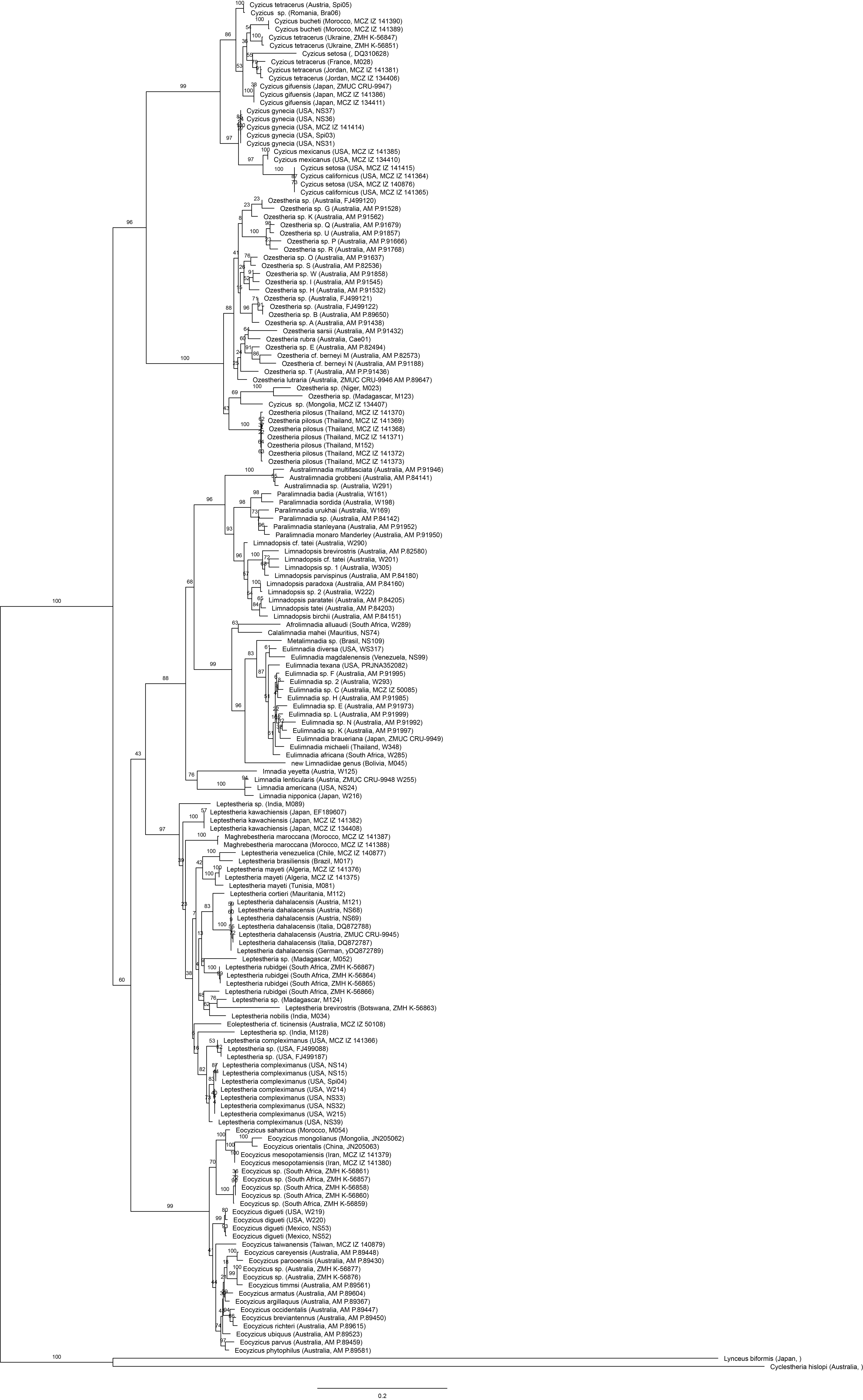 Spinicaudata (spiny clam shrimp) is a taxon of Branchiopods occurring since the Devonian and today it occurs nearly globally in temporary water bodies. We present the most species-rich phylogenetic analyses of this taxon based on four molecular loci: COI, 16S rRNA, EF1α and 28S rRNA. Our results support previous findings that Cyzicidae sensu lato is paraphyletic. To render Cyzicidae monophyletic we establish a fourth extant spinicaudatan family to accommodate Eocyzicus. Within Cyzicidae, none of the genera Cyzicus, Caenestheria or Caenestheriella are monophyletic, and the morphological characters used to define these genera (condyle length and rostrum shape) are not associated with well-delimited clades within Cyzicidae. There is insufficient resolution to elucidate the relationships within Leptestheriidae. However, there is sufficient evidence to show that the leptestheriid genera Eoleptestheria and Leptestheria are non-monophyletic, and there is no support for the genus Leptestheriella. Molecular clock analyses suggest that the wide geographic distribution of many spinicaudatan taxa across multiple continents is largely based on vicariance associated with the break-up of Pangea and Gondwana. Trans-oceanic dispersal has occurred in some taxa (e.g., Eulimnadia and within Leptestheriidae) but has been relatively rare. Our results highlight the need to revise the taxonomy of Cyzicidae and Leptestheriidae and provide evidence that the global spinicaudatan diversity may be underestimated due to the presence of numerous cryptic species. We establish Eocyzicidae fam. nov. to accommodate the genus Eocyzicus. Consequently, Cyzicidae comprises only two genera – Cyzicus and Ozestheria. Ozestheria occurs also in Africa and Asia and Ozestheria pilosa new comb. is assigned to this genus.