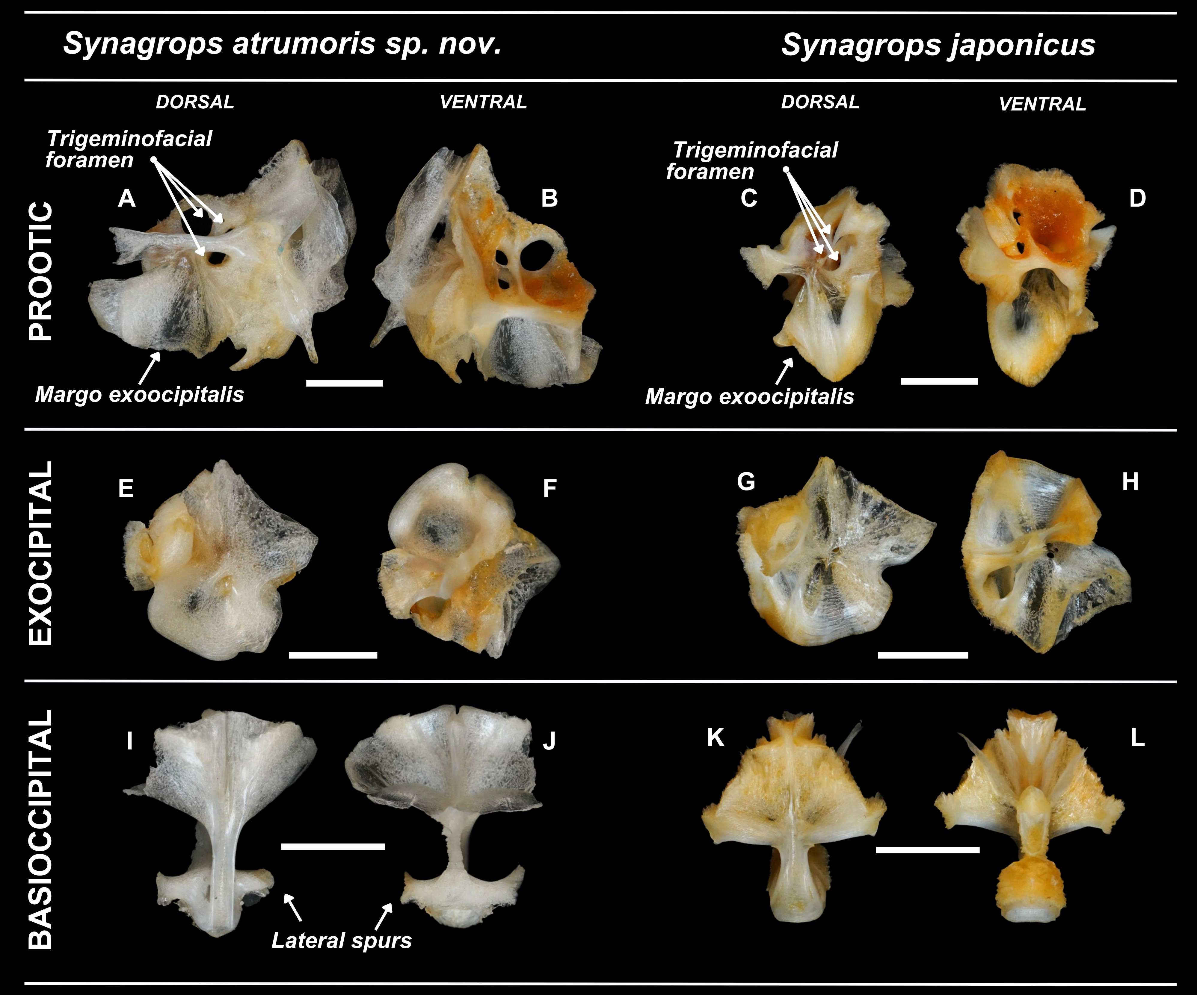 A new species of splitfin fish, Synagrops atrumoris sp. nov., from Dongsha Island, Taiwan, South China Sea, is described based on its morphological characteristics, including osteology and otolith morphology, and DNA sequence. Synagrops atrumoris sp. nov. is closely similar to Synagrops japonicus and can be distinguished by its black mouth cavity covering the lower portion of the tongue, posteriorly enlarged and complex basioccipital fossae, and a triangular otolith with a strong postero-dorsal angle, as well as a strong genetic difference. In addition, the taxonomy of the genus Synagrops was revised. Available published data, together with our results, suggest that S. bellus is a synonym of S. japonicus.